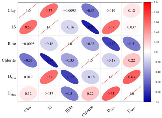 Furthermore, Liang Zhikai conducted a study on the pore structure of continental shale within the Changling fault depression. The findings of this study revealed a positive association between the fractal dimension of bound-fluid pores and clay minerals [21]. However, the observed relationship between the NMR fractal dimension of Funing Formation shale and the overall quantity of clay minerals does not correspond with prior studies, indicating the limited presence of a robust correlation. In order to enhance comprehension of this distinction, the present study delves further into the impact of diverse clay minerals on the two fractal dimensions. It was found that NMR fractal dimensions showed different correlations with different clay minerals (Figure 11). DMin and DMax exhibited robust correlations with illite, while DMin demonstrated a strong positive association with the illite mixed layer. Previous research into the adsorption capacities of various clay minerals indicated that their order of adsorption capacity is as follows: montmorillonite, smectite, smectite mixed layer, kaolinite, chlorite, and illite [38]. The increase in illite content was found to reduce the number of bound-fluid pores, resulting in a negative correlation with DMin. Furthermore, the presence of illite in shale samples can lead to pore blockage as a result of its interaction with water. Moreover, a high concentration of illite in these samples also has an impact on the fractal dimension of large-pore movable-fluid pores.