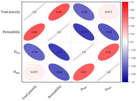 The utilization of the NMR fractal dimension can be regarded as a viable approach for evaluating the physical characteristics of shale [18,41], as depicted in Figure 12, which illustrates the relationships among total porosity, permeability, and fractal dimensions derived from NMR experiments. The findings reveal a noteworthy negative correlation between DMin and DMax with permeability. Additionally, DMin exhibits a negative correlation with total porosity. Both fixed and mobile pores contribute to the overall porosity of the specimen. The augmentation of bound-fluid pore dimensions can effectively increase porosity by expanding the available pore volume. However, this increase in pore size can reduce the heterogeneity of the pore structure, resulting in a decrease in the fractal dimension DMin.