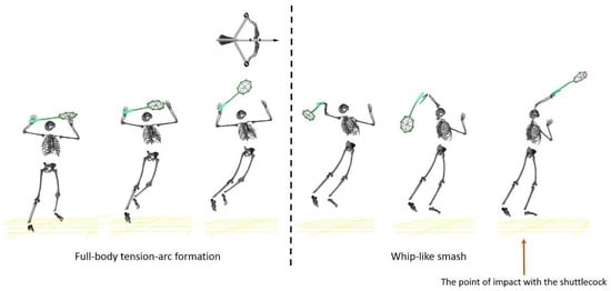 In order to execute a powerful smash, it is essential to apply biomechanical principles during the various phases of the motion sequence [43,44]. However, previous research has shown inconsistency in defining these phases, with some studies recognizing about two phases, namely the backswing and acceleration phases [33,34,45], while others describe four phases, encompassing preparation, backswing, forward swing, and follow-through [6,46]. Furthermore, these definitions tend to predominantly focus on upper body coordination, overlooking the importance of full-body control. It is worth noting that a smash involves comprehensive control of the entire body. When considering the concept of full-body control, akin to other explosive power-generation sports skills like the javelin throw [47,48] and the maximal instep soccer kick [49,50], the smash can be conceptualized as a process involving the formation of a full-body tension arc followed by a whip-like smash, as illustrated in Figure 1. The whip-like smash (proximal to distal control sequence among the upper body segments) has been confirmed by a previous study [5]. During this whip-like smash, the control of the racket, transitioning from an upward to a downward position, should be a passive movement [51,52], occurring naturally due to inertia without requiring active wrist control. Recognizing the passive nature of this control simplifies the process of motor learning, aligning with the principle that reducing the need for simultaneous joint control makes motor learning easier [53,54].