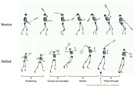 Building upon insights garnered from previous research, the present study seeks to conduct a comprehensive 3D motion analysis of the entire sequence of the skill using both novice and advanced players. The hypothesis posits that skilled players will demonstrate a higher level of proficiency in distinct and pivotal biomechanical determinants, exerting a substantial impact on the overall quality of the forehand smash. Utilizing a comparative approach between the two player cohorts, the quantitative analysis is centered on the discernment of the specific biomechanical determinants’ influence. These determinants encompass elements such as precise body positioning, the X-factor denoting trunk rotation, and kinetic determinants that encompass control mechanisms related to the racket angle and major joints. These parameters draw upon prior research findings [5,6,29,33,34]. The overarching objective is to unveil the fundamental biomechanical underpinnings that govern the execution of this pivotal shot, thereby facilitating skill acquisition, particularly among novice practitioners in the sport. To bridge the gap between scientific research and coaching practice, the findings target the supply of practical implications for coaches and players by providing biomechanically grounded and coaching-friendly explanations—explanations that directly communicate with the experiences of coaches, practitioners, and learners—regarding skill characteristics and motor control sequencing. As such, relevant biomechanical factors are identified in a way that should help coaches better develop training programs and, at the same time, foster a better understanding of the skill among learners. The ultimate objective is to improve coaches’ training effectiveness and better develop plans for novice badminton players. For beginners, we speculate that faster and more effective skill acquisition will potentially increase enthusiasm for and participation rates in the sport.