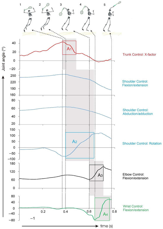 The explosively sequential whip-like smash observed in the skilled group. 1: the initiation of rapid trunk internal rotation (towards the non-smash side), A1: the duration of the fast trunk internal rotation; 2: the commencement of swift shoulder internal rotation, A2: the duration of the rapid shoulder internal rotation; 3: the start of rapid elbow extension, A3: the duration of the quick elbow extension; 4: the beginning of the fast wrist flexion, A4: the duration of the fast wrist flexion; and 5: impact with the shuttlecock.
