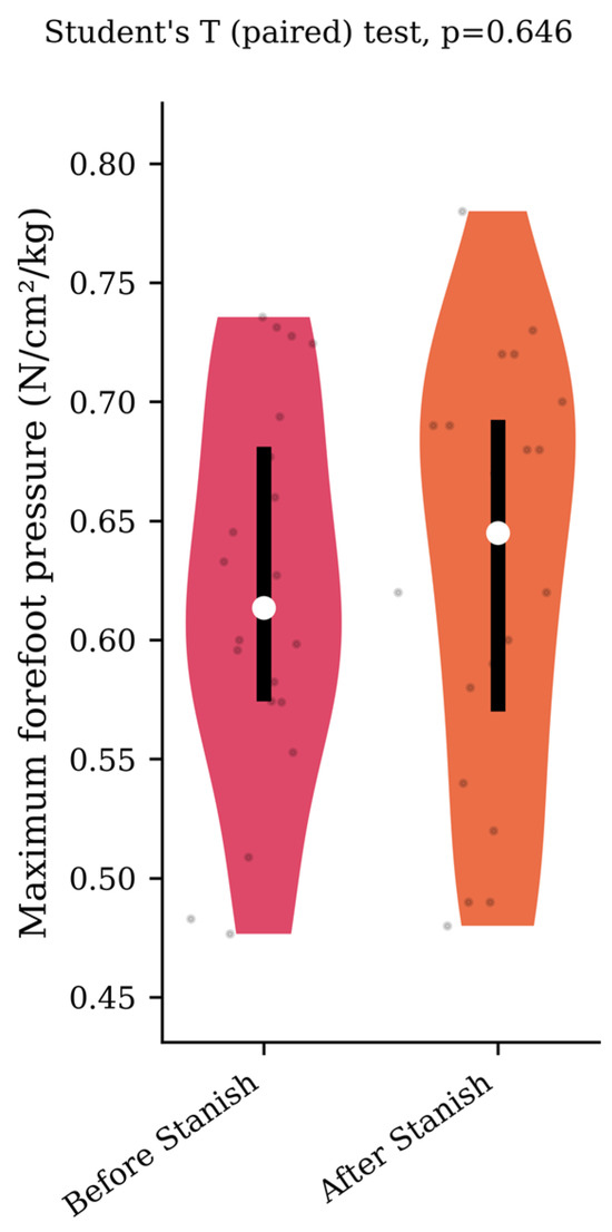 Maximum forefoot pressure before and after a Stanish protocol in the IGT group (n = 20).