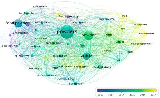 Keyword map representing publications on powdered foods. The circle size indicates the number of publications and the circle color represents the average year of publication. Two circles are close to each other if the keywords co-appeared more frequently. The data were obtained from the Scopus database and analyzed using VOSviewer software version 1.6.20.