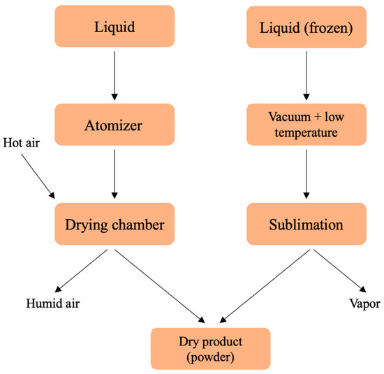 On the other hand, when the material is liquid, the process can occur via spray-, freeze-, drum-, or belt-drying; crystallization; or other methods [4]. In this review, the spray- and freeze-drying processes will be covered, as they are the most widely used technologies, as well as their respective processes to obtain powdered foods (Figure 2).