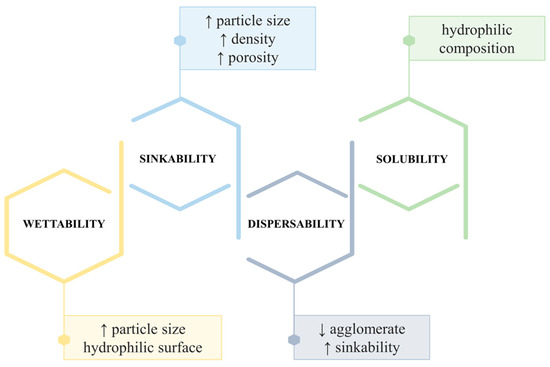 As for instant properties, the desirable characteristics of powdered products can be categorized into four dissolution parameters: wettability, sinkability, dispersibility, and solubility. These properties represent the steps involved in the reconstitution of powdered products [10,37,38]. Figure 3 presents dissolution properties and how to improve their characteristics.