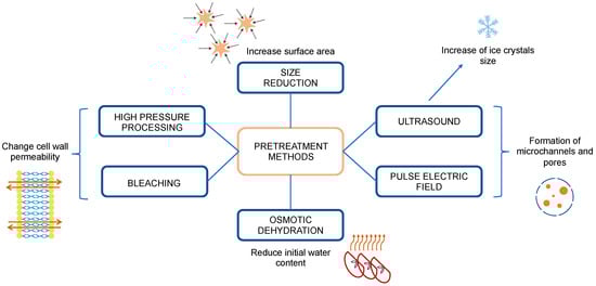 Dziki [51] reported the advantages and importance of pretreatment in the freeze-drying process. Many methodologies can be applied to food, including size reduction, bleaching, osmotic dehydration, ultrasound, and others. For instance, the application of bleaching not only induces enzymatic inactivation in fruits and vegetables but also contributes to a reduction in drying time [51]. Figure 4 illustrates the pretreatment methodologies commonly employed in the drying of foods.