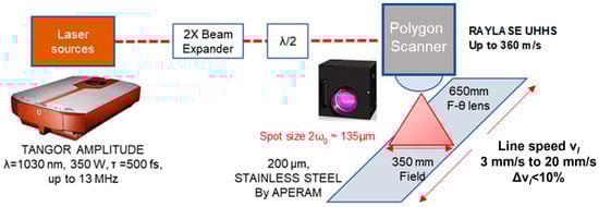 A linearly polarised, 450 fs, λ = 1030 nm, laser source delivering a maximum average power P = 310 W with maximum repetition rate RR = 13 MHz (Tangor, by Amplitude Laser, Pessac, France) was utilised to generate nanometric laser-induced periodic surface structures (LIPSS) on the surface of a 200 μm thick, 304 stainless-steel coil (see Figure 1). The coil width was 40 cm. Estimations of the surface roughness value Sa were obtained by means of the software ConfoMap ST 8.2 after surface profile acquisitions carried out with a ×50 optical profilometer (Smart Proof 5, by Zeiss, Göttingen, Grmany). The laser beam was magnified by a factor of 2, then deflected by a hybrid polygonal galvanometric scanning head (UHSS-II-15, by Raylase, Wessling, Germany) and focused through an F-theta lens with focal length f = 650 mm. This system enables scanning speeds as high as 360 m/s with a scanning field ≥350 mm. The coil is automatically unwrapped through a motorised rotator, then pulled for nearly 1.5 m through a second rotator. Before reeling, the coil passes beneath the laser beam. The web tension can be adjusted between 10 MPa and 100 MPa, and the line speed vl can vary between 3 mm/s and 20 mm/s. Amongst the metallic sheets (Al, Ti, Mg alloys, etc.) which are commonly subjected to forming [], we chose stainless steel since it has been widely studied in USP laser nanotexturing []. The chosen thickness value was the maximum compatible with our set-up. Handling of thicker coils will require the implementation of more powerful motorised rotators.