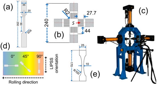 (a) Specimen geometry for standard tensile testing; (b) cruciform specimen geometry dedicated for the mechanical testing performed in three loading modes (plane strain, uniaxial and biaxial); distance between slits S was 300 µm; (c) cruciform specimen testing setup equipped with a Digital Image Correlation system for deformation tracking; (d) direction of cutting for specimens in three different directions with respect to LIPSS orientation; (e) hourglass specimens for the fatigue tests. All values are given in mm.