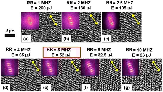 Nanometric LIPSS are currently being evaluated to produce next-generation advanced materials in a wide range of application sectors, such as the biomedical, aerospace, automotive, food-handling, home-appliance industries, and so on [,,]. The generation of LIPSS over surfaces much larger than the spot size (>>1 cm2) is normally achieved by the raster scanning technique. In this case, large-scale LIPSS homogeneity is linked to the laser process parameters, mainly the energy dose Φ and the laser beam polarisation orientation []. Φ corresponds to the cumulative energy deposited on the unit of irradiated surface (J/cm2) and takes into consideration key parameters such as the energy per pulse E, the repetition rate RR and the spatial overlap between successive pulses, which in turn play a role in thermal accumulation phenomena []. In order to define a set of laser process parameters where LIPSS are generated uniformly, the energy dose Φ was fixed at 0.55 kJ/cm2 and the scan speed at 90 m/s coherently with results reported for similar experimental conditions []. Moreover, to maximise the throughput, the average power P was kept constant at 260 W (i.e., the maximum available on the stainless-steel coil after optical losses), and RR was varied in the range of 1–10 MHz, corresponding to E varying from 26 µJ to 260 μJ, respectively. Laser-treated surface morphologies were finally analysed by SEM (Vega3, by Tescan, Brno, Czech Republic). Figure 3 presents SEM images of the laser-treated surfaces, and for each image, the insets show the respective FFT analyses. The yellow arrows represent the orientation of the laser beam polarisation on the irradiated surface. Starting from relatively low RR (RR = 1 MHz and RR = 2 MHz) the LIPSS morphology was irregular and not well-defined. In these cases, the corresponding E (respectively, E = 260 µJ and E = 130 µJ) was too high, leading to important ablation phenomena and preventing the generation of uniform structures. Increasing RR, E decreased, and structures became more regular. An optimum appeared in correspondence with RR = 5 MHz and E = 52 µJ s. Further increasing RR, the E decreased proportionally, and the observed morphology underwent a slight degradation. Similar results have been already reported in the literature for Steel [,] and ascribed to the increase in the spatial overlapping between two successive pulses. In fact, this led to an extension of the surface where the surface plasmon polaritons generated by the second pulse interacted with the pattern generated by the first, thus decreasing the pattern regularity.