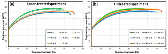 Results of standard tensile test—engineering stress vs. engineering strain diagrams of representative specimens cut from (a) untreated and (b) laser-treated sheets; designation system in the legend: T/NT—laser-treated/untreated, 0/45/90—specimen orientation with respect to the rolling direction of metal sheet. For laser-treated samples, specimens cut at 90° represent specimens where the strength is applied in the same direction as the LIPSS orientation.
