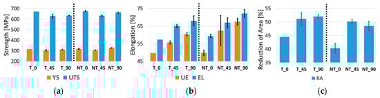 Results of tensile stress tests carried out on laser-treated (T) and untreated (NT) specimens in different cutting directions. (a) Yield strength (YS) and ultimate tensile strength (UTS), (b) uniform elongation (UE) and total plastic deformation (EL), and (c) reduction of area (RA). Error bars represent standard deviation values.