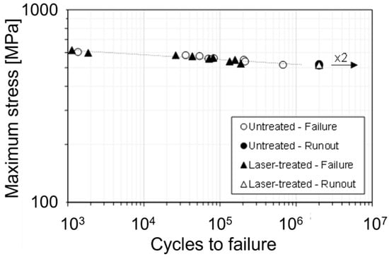 Results of fatigue tests carried out on laser-treated and untreated specimens. The arrow indicates the number of specimens that reached the runout.