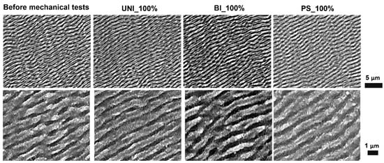 Although a slight reduction in the LIPSS height might be expected [], the results shown in Figure 7 indicate that the LIPSS morphology was not affected by the mechanical load, regardless of the direction along which the load is applied. The morphology observed before the tests (Figure 7 left) was kept unchanged not only at 100% but also for specimens subjected to a load (pre-strain) value, enabling an elongation of, respectively, 75%, 50% and 25% of the failure (micrographs not shown).