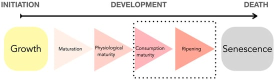 As can be seen in Figure 1, specifically on the black dotted rectangle, consumption maturity, and ripening stages are the most representative of the maturity diagram because these are the stages when humans can consume fruits and vegetables. In addition, the senescence stage includes the aging of cells until they stop reproducing. These stages of consumption correspond to the ideal stages for human consumption since they provide all the maximum nutrients that the fruit or vegetable can produce.