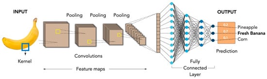 Artificial Neural Networks (ANNs) are widely used in the food industry, but specifically for Convolutional Neural Networks (CNNs), one of the limitations is the lack of a substantial dataset to perform their training []. The detection of fruits and vegetables using AI is a topic of great interest today. A review of the state of the art shows that there are numerous works focused on the development of classification algorithms and neural networks for the identification of different types of fruits. These techniques are based on computer vision and range from binary to hyperspectral images [,,]. In computer vision, the hyperspectral systems combine spectral information for each pixel []. Cutting-edge deep learning techniques have been applied to fruit and vegetable classification. In two previous studies [,], researchers have used Faster R-CNN to develop fruit recognition systems that can be used in harvesting, smart farming, and packaging. These systems have been trained on real-life orchard images and can work in different lighting conditions. One way to improve the accuracy of apple detection is to add a suppression branch to Mask R-CNN [,]. Also, research detects the quality of coffee beans using CNN and color space models, distinguishing between the quality categories of under-roasted coffee beans [].