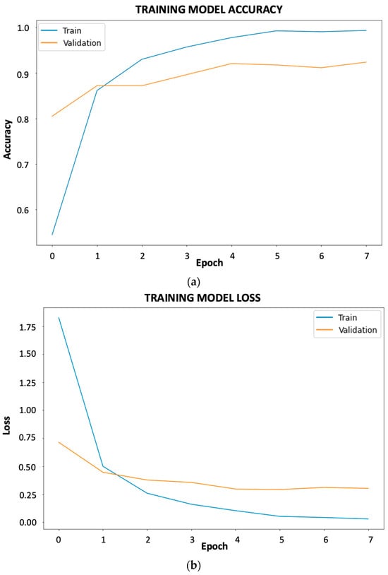 As can be seen in Figure 5, both the accuracy and loss curves show that there is no overfitting or underfitting as they continue up and down, respectively. At this stage, an early stopping condition was implemented with the parameters that the algorithm stops if the accuracy and loss do not improve. This ensures that the following phenomena do not occur.