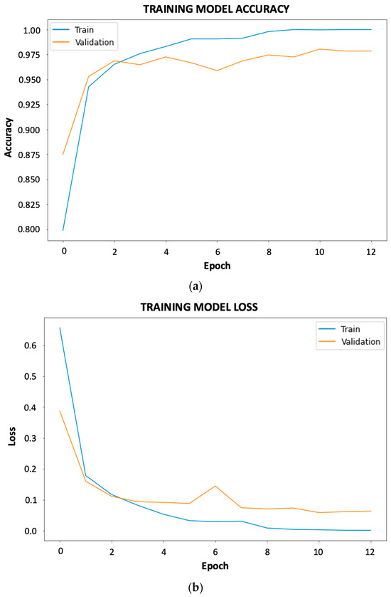 Accuracy and loss curves of the best results for fruit and vegetable ripeness: (a) accuracy; (b) loss.