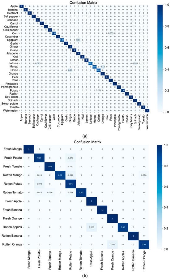 Confusion matrix: (a) classification of fruits and vegetables; (b) stage of ripeness.