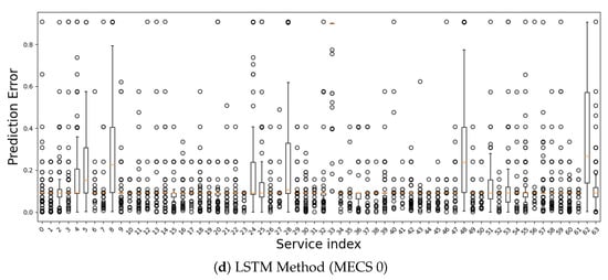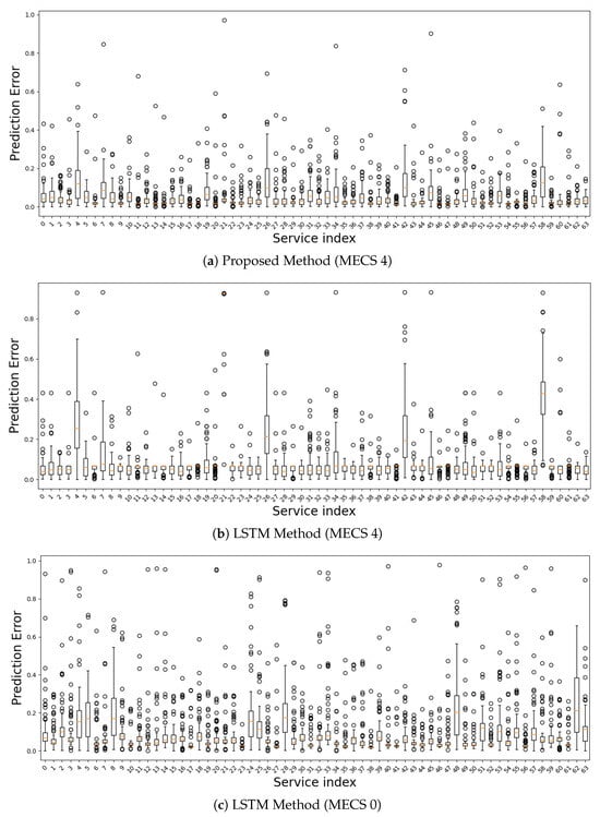 k = 33 in MECS 4 obtained by our method is 0.080, while it is 0.90 when the LSTM method is used. We also observe that the interquartile range (IQR), which is the difference between the 75th percentile and the 25th percentile, is smaller when our method is applied compared to when the LSTM method is used. For example, in MECS 4, the average IQR acquired by our method is 0.034, while it is 0.046 when the LSTM method is applied. The results are attributed to the manner that each method predicts the service popularity. When the LSTM method is used, each MECS predicts the popularity of each service within its service range, regardless of the service popularity distributions in the other MECSs. On the contrary, our method predicts the popularity of each service in each MECS at the same time by comprehensively considering the service popularity distributions all over the MECSs. Therefore, our method reduces the amount of error in predicting the popularity of each service in each MECS. We obtain the same results in all the other MECSs.