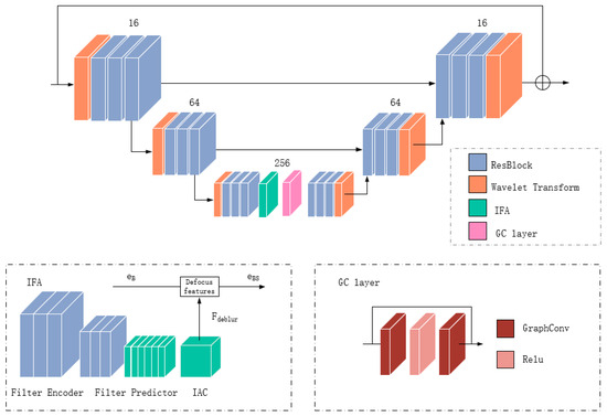 Recent research has primarily focused on enhancing network architectures, introducing multi-scale and increasing receptive fields to enhance the performance of image restoration algorithms. Ronneberger et al. [2] proposed an encoder–decoder structure network (U-net), which effectively exploits contextual information to achieve superior performance in image semantic segmentation. Nah et al. [9] applied multiple scales to defuzzing networks, gradually removing differences in the degree of ambiguity. Chen et al. [10] embedded smooth dilated convolution to the network, while keeping the number of parameters in receptive fields constant to improve network performance. Zuozheng Lian et al. [11] introduced an enhanced U-Net, incorporating depth-wise separable convolutions, residual depth-wise separable convolutions, and wavelet transform. This approach enables the extraction of finer image details while simultaneously reducing computational complexity. Qian Ye et al. [12] introduced a network designed to establish direct mapping from a blurred input image to a clear image, leveraging the estimated defocus map to condition this mapping process. Li et al. [13] introduced the blind text image deblurring method to obtain a clean text image from the given blurry text image without knowing the blur kernel. However, their algorithm still lags behind mainstream deblurring algorithms in terms of processing time. Additionally, it does not achieve satisfactory results in the task of image deblurring caused by defocusing. Joan Bruna et al. [14] cascaded wavelet transform convolution and nonlinear modulus calculations to compute translation-invariant image features, preserving high-frequency information for classification. In another interesting work, Bae et al. [15] discovered that wavelet transform within CNNs is beneficial for single-image super-resolution and introduced wavelet residual networks. Yanyun Wu et al. [16] presented a deblurring method that employs a two-level wavelet-based convolutional neural network (CNN). This network incorporates discrete wavelet transform (DWT) to distinguish image context from texture information, consequently reducing computational complexity. Additionally, Junyong Lee et al. [4] introduced an Iterative Adaptive Network to address spatially varying blur. Their approach enhances the network’s deblurring capabilities by predicting a unique deblurring filter for every pixel within the image.