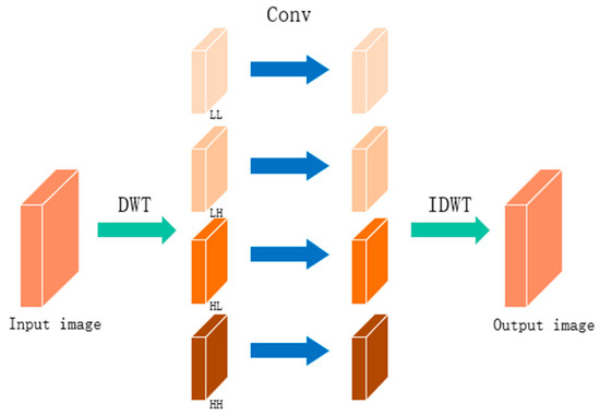 In this work, the pooling and upsampling layers in the U-net were substituted with discrete wavelet transform (DWT) and inverse discrete wavelet transform (IDWT), respectively. During the encoding phase, a series of convolutional operations and DWT were employed to extract informative features from the input image. Subsequent to DWT processing, the data size was reduced to one-quarter of its original size, whereas the number of channels was quadrupled (Figure 3). Unlike conventional pooling layers that may lead to the loss of some original information due to methods like merging or adjusting convolutional strides to reduce data size, our approach can mitigate the data loss caused by this step.