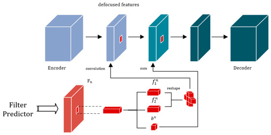 The IFA module [4] was added at the bottom of the U-net. IFA takes the defocused feature map extracted by the network as input and outputs the deblurred feature map. In the IFA module, Ib, which is the same as the main network input, was introduced to predict the deblurring filter. IFA consists of a filter encoder, a filter predictor, and an Iterative Adaptive Convolution layer (IAC). The filter encoder encodes Ib as eF ∈ Rh×w×256, the filter predictor predicts the deblurring filter map Fdeblur ∈ Rh×w×cFdeblur, where Fdeblur is c (2k + 1), c is 256, and k is 3, and finally, the IAC layer uses the prediction filter Fdeblur to transform the input feature eB to generate the deblurring feature eBS.