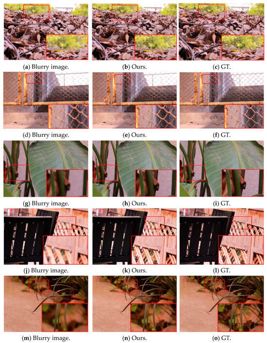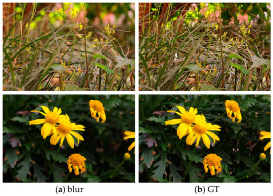 The DPDD dataset [1] was employed to train our network, which is a commonly used end-to-end defocus dataset. In addition, our own dataset (Figure 6) was created. To this end, a Canon EOS 800D camera was utilized to capture a pair of identical static images at various apertures (F1.8-F22). As the aperture size varied, the depth of field in the captured images differed, resulting in both clear (Ground Truth) and defocus blurred images. The specific capture procedure was as follows: First, the camera was securely positioned on a tripod to maintain stability throughout the entire shooting process while keeping the lens focal length constant. The aperture was adjusted to its minimum value to acquire fully clear images and subsequently switched to its maximum value to obtain blurred images. Throughout the entire capture process, the automatic exposure mode was employed to adjust the exposure time, ensuring consistent brightness across all images. To capture diverse scenes and different types of defocused and blurred images, 100 scenes (indoor and outdoor settings) and varying focal lengths were examined for image acquisition. Similarly, our custom-made dataset comprised a total of 500 pairs of images. These images were divided into training, validation, and test sets, with each set containing 400, 50, and 50 scenes, respectively.
