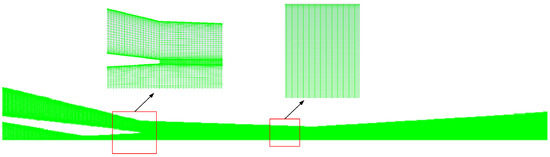 Since the steam ejector had an axisymmetric structure, the two-dimensional axisymmetric mesh could be used to replace the three-dimensional mesh [13]. ICEM was used to mesh the steam ejector. The mesh distribution of the steam ejector is shown in Figure 2. The meshes near the nozzle and the wall of the steam ejector were refined. Four meshes were selected for the grid independence verification analysis with a mesh number between 30,000 and 90,000. When the mesh number exceeded 78,000, the numerical simulation results no longer changed. In order to save calculation time, it was determined that the mesh number of the steam ejector should be no less than 78,000.