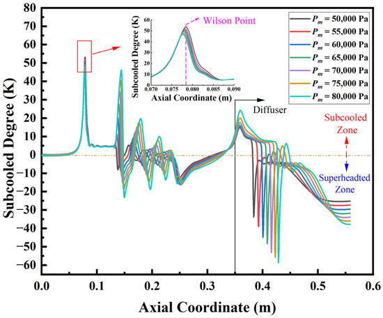 The nonequilibrium phase change process in the steam ejector was analyzed through the distribution of the steam subcooled degree and steam wetness fraction on the axis of the steam ejector. The subcooled degree is defined as the difference between the steam pressure and the saturation temperature. The distribution of the subcooled degree can reflect the variation trend of the steam thermodynamic state well. Figure 4 shows the distribution of the subcooled degree of the steam ejector axis under different Pm. It can be seen from the figure that the subcooled degree increased continuously after the primary flow passed through the nozzle throat. The droplet released latent heat of condensation in the process of growth based on condensation nuclei and the primary flow suddenly dropped. The inflection point of the subcooled degree is called the Wilson point [34]. When the primary flow passed through the nozzle outlet, a series of shock waves alternating between compression waves and expansion shock waves were generated in the mixing chamber. When the primary flow passed through the compression shock wave, the subcooled degree was negative; that is, the primary flow was in a superheated state. When the primary flow passed through the expansion shock wave, the subcooled degree increased further and the steam was in the nonequilibrium state of supercooling. When the primary flow was mixed with the secondary flow, a choking effect occurred in the mixing chamber. At this time, the subcooled degree of the primary flow reduced from 3 K to −18 K. This meant that the choking effect caused the mixed flow to overheat. After entering the diffuser, the mixed flow accelerated the expansion and the subcooled degree increased. Then, under the choking effect of the shock waves in the diffuser, the subcooled degree changed from positive to negative and the mixed flow changed from the supercooled state to the superheated state.