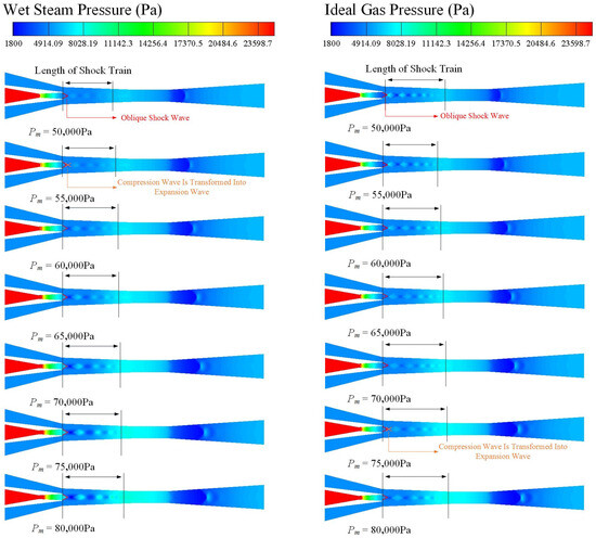 - Under different Pm, the structures of the shock wave train for the wet steam model and the ideal gas model were different. For the wet steam model, the first shock wave changed from a compression shock wave to an expansion shock wave when the Pm was 55,000 Pa. For the ideal gas model, the compression shock wave changed to an expansion shock wave when the Pm was 75,000 Pa.