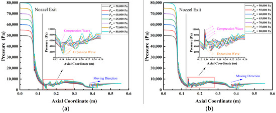 Pressure distribution along the steam ejector axis under different Pm. (a) Wet steam model; (b) ideal gas model.