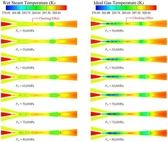 Temperature contours under different Pm for wet steam model and ideal gas model.