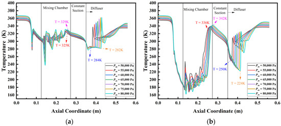 Temperature distribution along the steam ejector axis under different Pm. (a) Wet steam model; (b) ideal gas model.