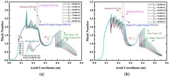 The Mach number distribution under different Pm is shown in Figure 11. When the Pm was 50,000 Pa, the Mach number at the nozzle exit for the wet steam model was 2, and that for the ideal gas model was 2.37. When the Pm increased from 50,000 Pa to 80,000 Pa, the axial position at the end of the shock wave train for the wet steam model varied from 0.229 m to 0.237 m, and that for the ideal gas model varied from 0.231 m to 0.247 m. According to the analysis in Figure 4, it could be seen that the primary flow was in an overheated state when it passed through the compression shock wave, while it was in a supercooled state when it passed through the expansion shock wave. This caused the droplets to evaporate and condense continuously within the shock wave train. In this process, the condensation latent heat absorbed and released by the droplet caused the Tm and the Pm to slightly fluctuate, thus, reducing the energy loss of the shock wave. Therefore, the variation in the length of the shock wave train for the wet steam model was shorter than that for the ideal gas model. In the diffuser, the mixed flow changed from a supersonic fluid to a subsonic fluid, and the Mach number suddenly decreased. When the Pm was 80,000 Pa, the Mach number for the wet steam model decreased from 1.78 to 0.78 and the Mach number for the ideal gas model decreased from 1.92 to 0.77. This showed that the variation range of the secondary shock wave in the diffuser for the wet steam model was smaller than that for the ideal gas model.