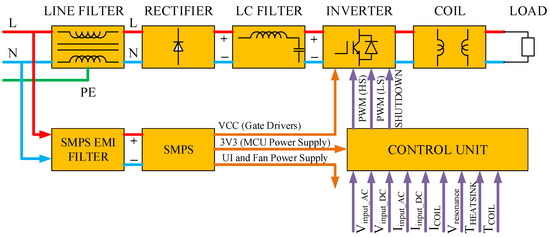 Induction cooking applications have been drawing attention due to their superior performance, such as fast heating, efficiency, controllability, cleanness, safety, and lower carbon emissions, for a long time. The working principle of an induction cooktop is based on Faraday’s Law. It produces a high-frequency magnetic field with the help of a power electronics converter and an induction coil, and then this magnetic field induces eddy currents directly beneath the ferromagnetic pan. As a result of this process, joule and hysteresis losses heat up the pan [1]. The basic building block is shown in Figure 1.