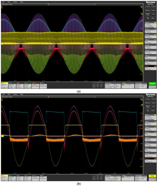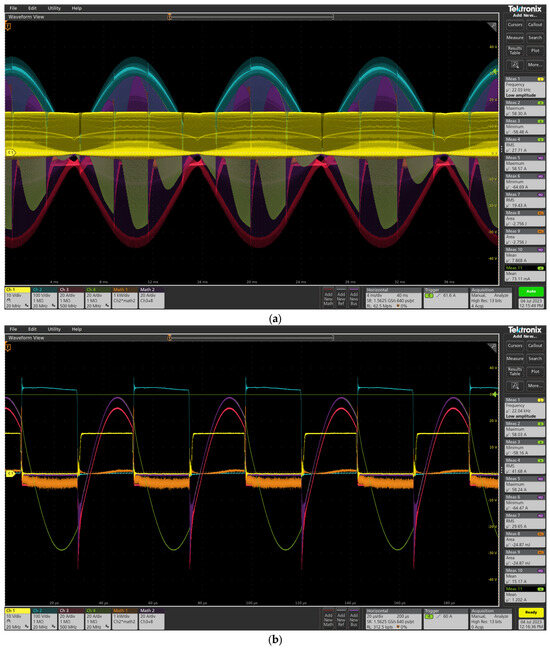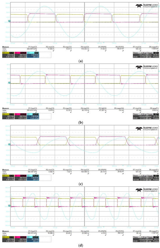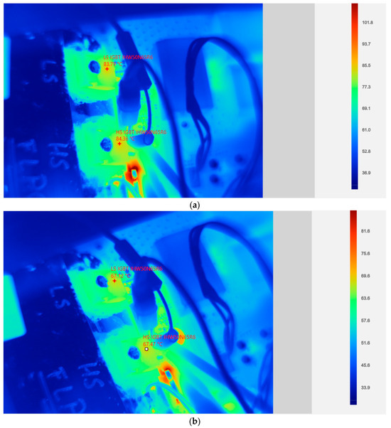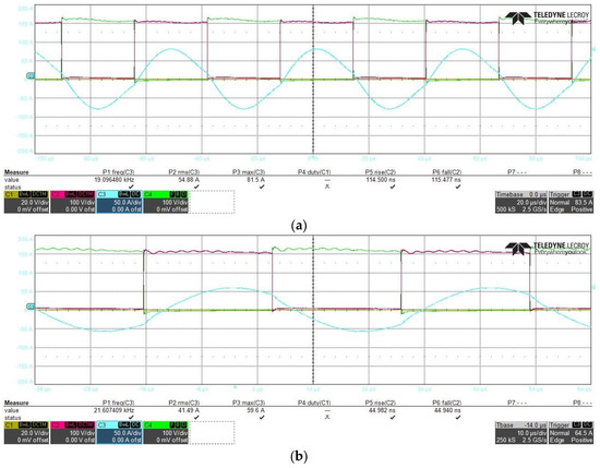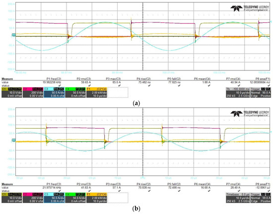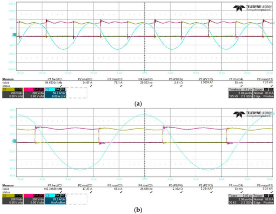 As mentioned in the previous sections, the WBG power semiconductor enables us to increase switching frequency due to its superior switching performance. In this section, the WBG device is tested at a high switching frequency without sacrificing power ratings. While the oscilloscope measurements are shown in Figure 13a,b, thermal measurements are shown in Figure 14a,b. The power circuit parameters and power losses are shown in Table 7 and Table 8, respectively.