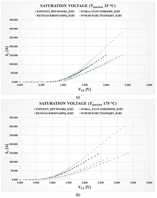 IGBT saturation voltages at different junction temperatures: (a) IGBT voltages at 25 C junction temperature; (b) IGBT voltages at 175 C junction temperature.