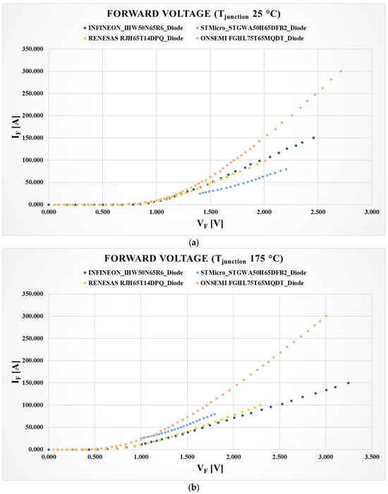 The datasheet parameters are used preliminarily to compare IGBTs. The first parameter is the saturation voltage. Figure 4a,b show saturation voltages of IGBTs for different junction temperatures. The second parameter is the diode forward voltage. Figure 5a,b show forward voltage drops for different junction temperatures. As mentioned above, conduction loss is the major contributor to total switch loss. Therefore, is the most crucial parameter to determine IGBT.