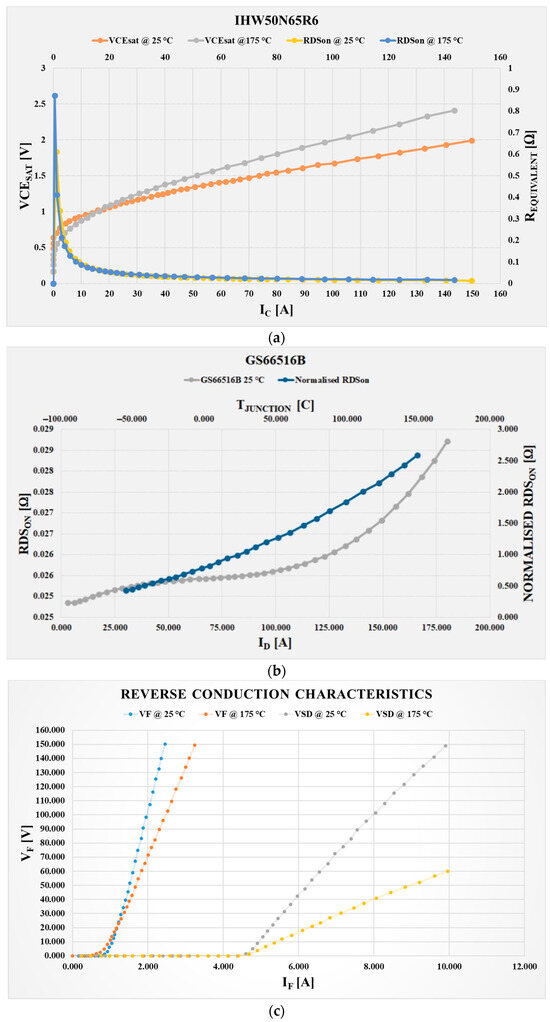 Characteristics of selected power semiconductors for domestic induction heating application: (a) IHW50N65R6 IGBT characteristics for different junction temperatures; (b) GS66516B characteristics for different junction temperatures; (c) Reverse conduction characteristics for both.