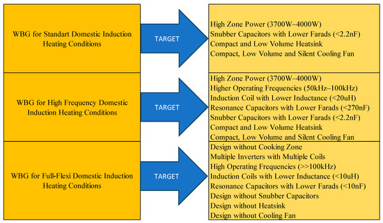 The WBG power device is tested at different operating conditions to find out the optimum operating conditions to use WBG power semiconductors properly. First, the WBG power semiconductors are operated in conventional domestic induction cooking conditions and analyzed at high power and low switching frequencies. Secondly, WBG power semiconductors are analyzed by operating at high switching frequencies with the same zone powers as conventional induction cooktops. Finally, WBG power semiconductors operate in high-segment full-flexi induction cooktops and are analyzed for different switching frequencies and powers. At the end of the measurement results, advantages and disadvantages are listed. When and how to use this new generation of power semiconductors in domestic induction cooktops is elaborated in detail. Figure 7 shows the roadmap for how to integrate WBG devices into domestic induction cooktops.