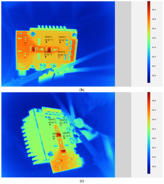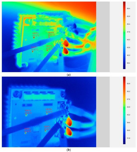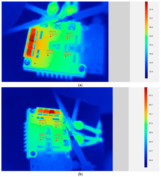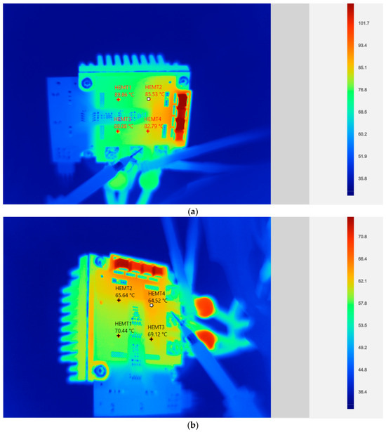 GS66516B thermal measurements at high-frequency induction cooking operation: (a) Thermal measurements of operating condition 1; (b) Thermal measurements of operating condition 2.