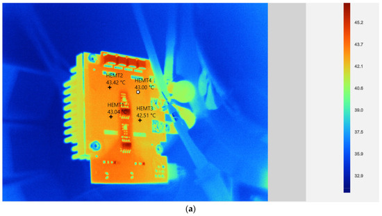 Most domestic induction cooktops need ferromagnetic pans to heat up. They cannot heat non-ferromagnetic materials such as copper and aluminum because of their low equivalent resistance () and inductance (). To transfer high power ratings (above 2.3 kW) to non-ferromagnetic pans with modern induction cooktops, coil and switch current ratings increase to levels that Si-based power semiconductors are not able to withstand. These types of pans can be heated up to high power levels by increasing the switching frequency to increase the equivalent series resistance. WBG power semiconductors can be used in this type of application to increase switching frequency to heat non-ferromagnetic materials [20]. While oscilloscope measurements are shown in Figure 15a,b, thermal measurements are shown in Figure 16a,b. The power circuit parameters and power losses are shown in Table 9 and Table 10, respectively.