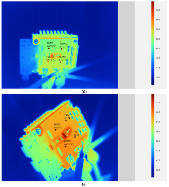 GS66516B thermal measurements at full-flexi induction cooking operation: (a) Operating condition 1; (b) Operating condition 2; (c) Operating condition 3; (d) Operating condition 4; (e) Operating condition 5.