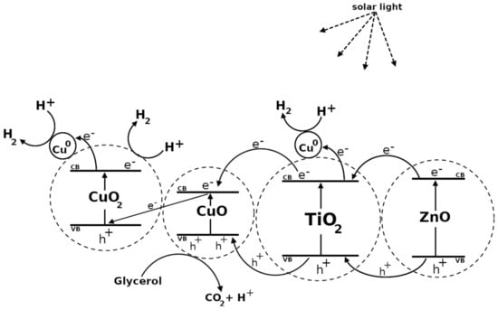 Subha et al. [38] synthesized a photocatalyst system based on TiO2 doped with Cu and Zn (CuZn-TiO2). TEM images and XPS spectra showed the presence of Cu2O, CuO, ZnO, and Cu0 on the TiO2 surface. Metal–semiconductor junctions and heterojunctions between semiconductors were formed due to the growth of Cu2O, CuO, ZnO, and Cu0 on the surface of TiO2. Effective charge separation due to the heterojunctions and high electron mobility due to Cu0 improved the H2 production. In addition, Cu0, CuO, and Cu2O allowed the absorption of TiO2 to shift to visible light. In particular, the CuZn-TiO2 with an optimum loading of Cu and Zn of 0.5 wt% achieved a H2 production of about 14,521 μmol h−1 g−1cat under solar light, using glycerol as sacrificial reagent. A plausible mechanism for H2 production is reported in the work of Subha et al. [38] and is schematically represented in Figure 1.