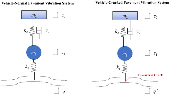 The equation of motion for a quarter vehicle-cracked pavement system is constructed following Equations (3) and (4).