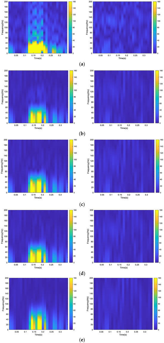 Time–frequency diagrams based on different wl between a transverse crack sample (left) and a normal section sample (right). (a) wl = 128; (b) wl = 64; (c) wl = 32; (d) wl = 16; (e) wl = 8.
