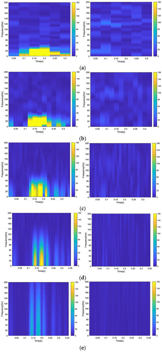 Different features in the time–frequency domain based on five window types between a transverse crack sample (left) and a normal section sample (right). (a) Rectangle window; (b) triangular window; (c) Hanning window; (d) Hamming window; (e) Blackman window.