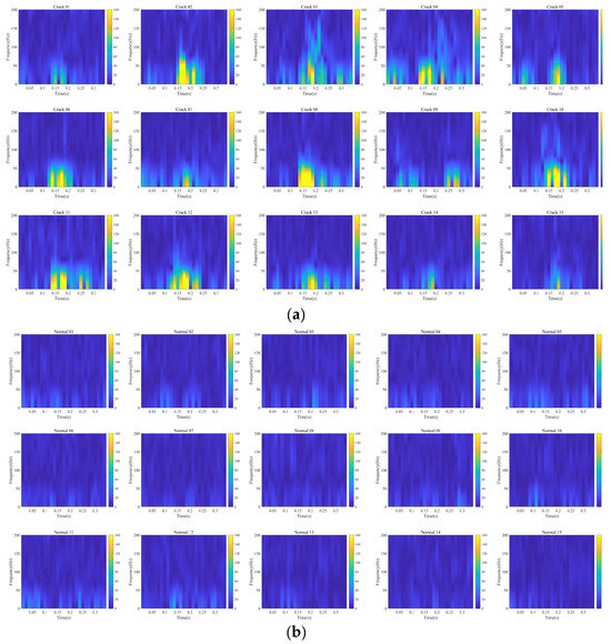 Based on the optimized STFT algorithm, the study chooses 30 manually labeled samples (transverse crack: 15, normal: 15) to explore their time–frequency features.