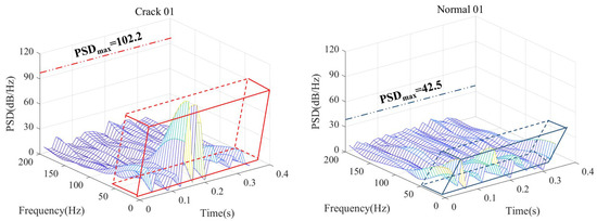 It was found that the power spectral density of the mutation feature caused by transverse cracks was above 100 dB/Hz (yellow highlight entry). While the normal pavement samples are below 80 dB/Hz (Figure 8). However, it was noted that the highlights of the three crack samples are not obvious. This results in an unreliable judge when only a feature has been mutated. The STFT algorithm demonstrates time-varying characteristics of the frequency domain brought about by signal mutations. A mutation at the cracked section causes a change in a certain frequency range. To verify this idea, we convert a two-dimensional time–frequency picture (the x-axis is time, the y-axis is frequency, and color depth denotes the power spectrum density) into a three-dimensional time–frequency map (the x-axis is time, the y-axis is frequency, and the z-axis is the power spectrum density).