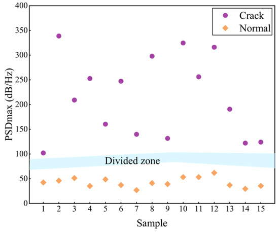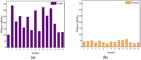 To validate the above idea, the PSDmax of 15 transverse cracks and 15 normal pavements were calculated as shown in Figure 10. As can be seen in Figure 10a, the transverse crack’s PSDmax distribution range is from 100 dB/Hz to 340 dB/Hz, with a maximum of 338.7 dB/Hz and a minimum of 102.2 dB/Hz. As shown in Figure 10b, the normal pavement’s PSDmax distribution range is from 29 dB/Hz to 63 dB/Hz, with a maximum of 62.0 dB/Hz and a minimum of 29.8 dB/Hz. The mean, standard deviation, and variation coefficients are shown in Table 3. Based on comparison of the standard deviation and coefficient of variation, the transverse crack’s PSDmax distribution is more discrete than the normal pavement.